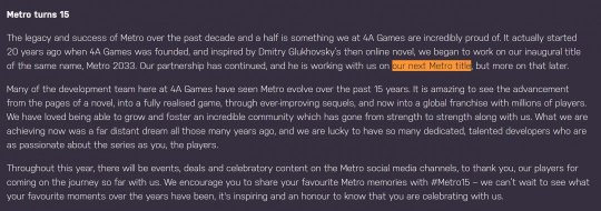 4A Games《地鐵》系列迎來發(fā)售15周年,在官網(wǎng)發(fā)布的博客中,4A Games確認(rèn)原著在線小說的作者Dmitry Glukhovsky正在和他們合作,開發(fā)下一款《地鐵》游戲。