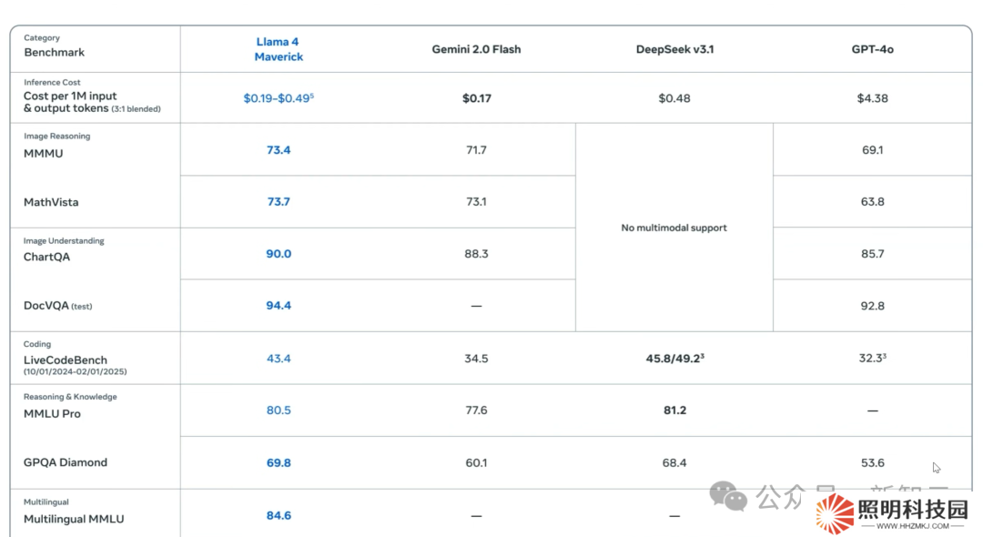 在下面這個表格中,Meta 將 Llama 4 和 Gemini2.0 Pro、GPT-4.5 等模型進行了比較,數(shù)字非常漂亮。