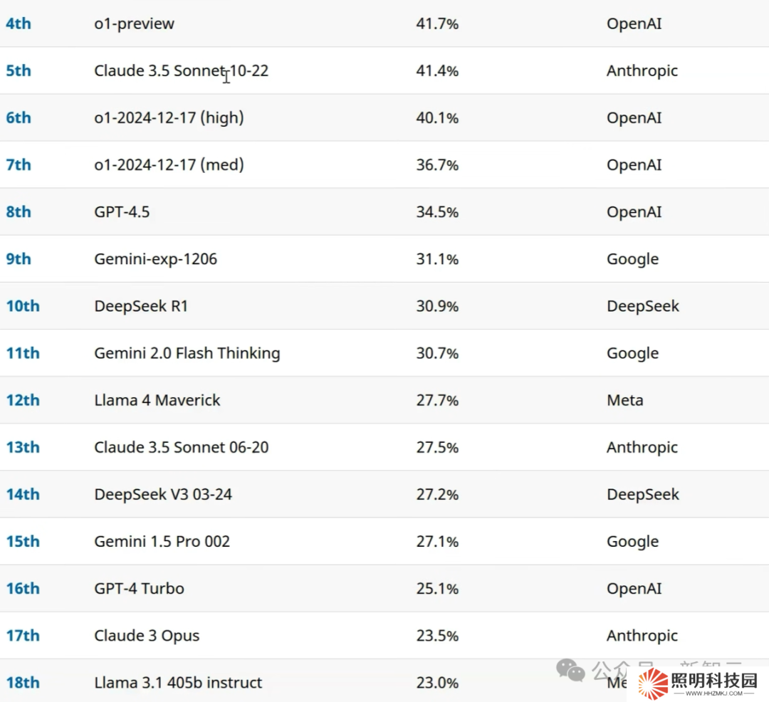 還有在 Simple Bench 中,Llama 4 Maverick 的得分大概為 27.7%,跟 DeepSeek V3 處于同一水平,還低于 Claude 3.5 Sonnet 這類非思維模型。