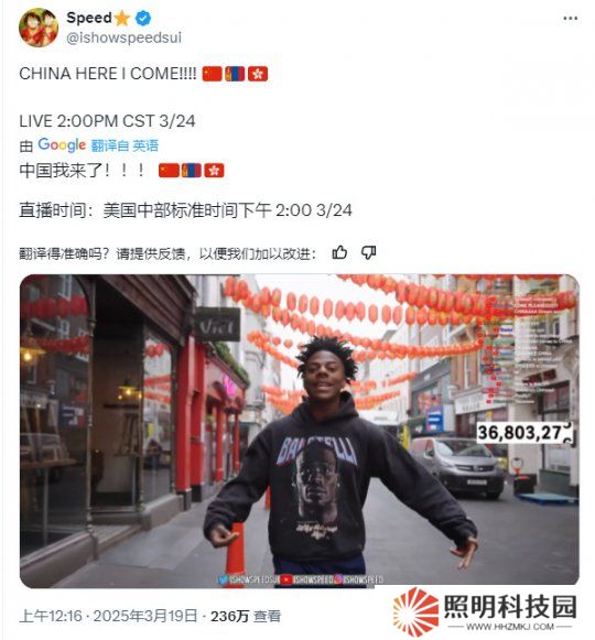 不過關(guān)于具體行程,IShowSpeed并未公布。