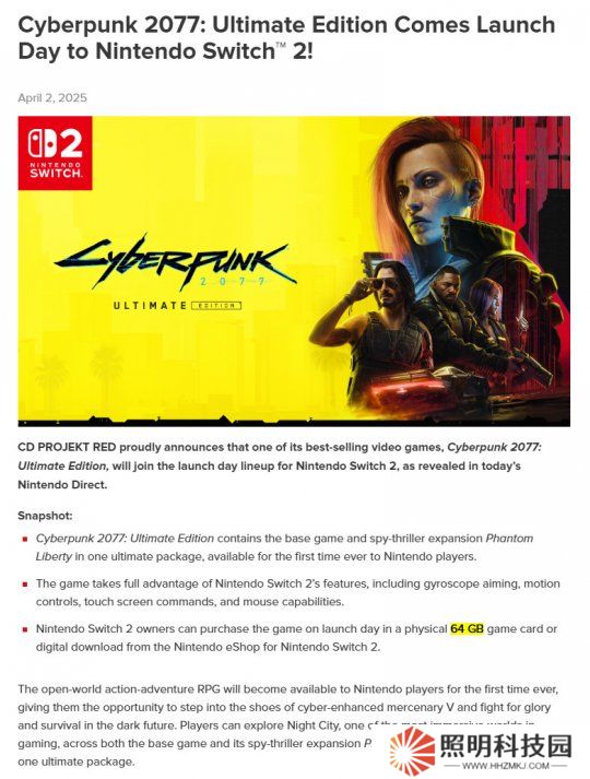 Switch 2部分游戲容量公布 《賽博朋克2077》需要64G