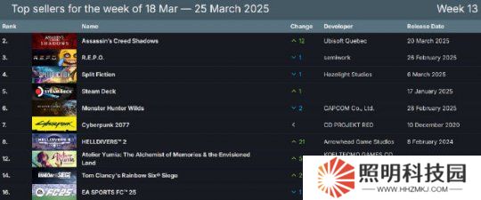 日前,Stema DB更新了2025年第13周Steam周銷榜的名單。其中,育碧開放世界游戲《刺客信條:影》登上了榜首位置。多人合作恐怖游戲《R.E.P.O.》,以及雙人合作冒險游戲《雙影奇境》分列第二和第三。