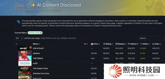 瀏覽SteamDB的玩家可以在其URL末尾添加&tagid=-1368160,以移除已披露使用生成式AI的游戲。