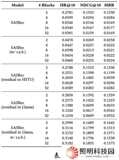為了進一步分析賦予模型擴展定律的因素,團隊比較了 SASRec 與擴展性良好的 HSTU 和 Llama 的區(qū)別,發(fā)現(xiàn)主要差異在于 RAB 和注意力模塊內(nèi)的殘差連接方式。