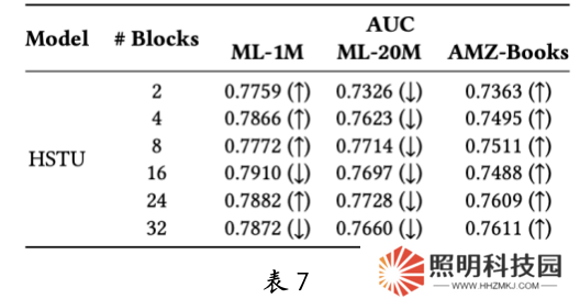 團隊還研究了負采樣率和評分網(wǎng)絡(luò)架構(gòu)對排序任務(wù)的影響,并進行了全面分析。此外,還探討了縮減 embedding 維度對性能的影響??s小 embedding 維度(表 7)提升了小數(shù)據(jù)集 ML-1M 和 AMZ-Books 的性能,但在大數(shù)據(jù)集 ML-20M 上則有所下降。這表明,推薦大模型的擴展定律不僅受垂直擴展(注意力模塊數(shù)量)影響,也受水平規(guī)模(embedding 維度)影響。