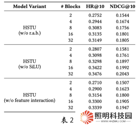 為了探究 HSTU 等生成式推薦模型的可擴展性來源,團隊進行了消融實驗,分別去除了 HSTU 中的關(guān)鍵組件:相對注意力偏移(RAB)、SiLU 激活函數(shù),以及特征交叉機制。