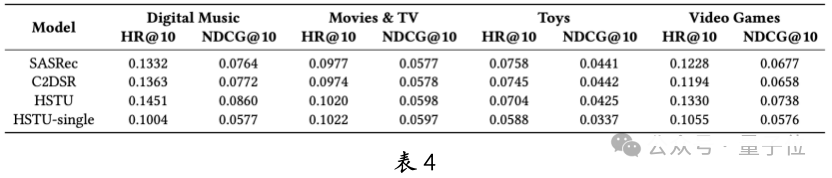 HSTU 在多域、多行為和輔助信息等復(fù)雜場景中表現(xiàn)出色。以多域為例,HSTU 在 AMZ-MD 的四個域中始終優(yōu)于基線模型 SASRec 和 C2DSR(見表 4)。