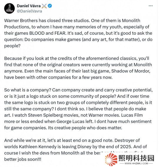今天華納宣布關(guān)閉包括《中土世界:魔多陰影》《極度恐慌》背后的開發(fā)商Monolith在內(nèi)的三家工作室,消息公布后,很多業(yè)內(nèi)人士表達(dá)了惋惜。不過《天國:拯救2》總監(jiān)Daniel Vávra表達(dá)了一個非常新穎的觀點(diǎn):藝術(shù)(包括游戲、電影等)的創(chuàng)造力本質(zhì)上來源于個體(即具體的創(chuàng)作者),而不是公司本身。他質(zhì)疑通常人們對公司品牌的認(rèn)知,他認(rèn)為公司只是一個外在的標(biāo)志,真正的創(chuàng)意和價值來自于背后的人。