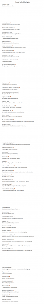 該獎(jiǎng)杯列表與《怪物獵人:世界》的列表非常相似,仍然包含“大小金”獎(jiǎng)杯,這也是游戲獲得白金杯過(guò)程中最耗時(shí)和最費(fèi)力的部分,值得一提的是,《怪物獵人:世界》的“白金率”為4.62%。以下是全獎(jiǎng)杯列表(包含劇透):