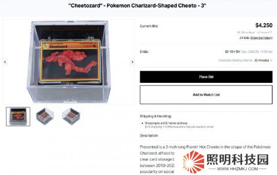 這款薯片為火辣味奇多薯片,顏色火紅、形狀神似噴火龍。在拍賣網(wǎng)站Goldin上,許多《寶可夢(mèng)》玩家競(jìng)相報(bào)價(jià),最終競(jìng)拍價(jià)格已超過4000美元(約合人民幣2.9萬元)。因?yàn)槌叩膬r(jià)值,這塊薯片被放置在一個(gè)定制的盒子中收藏。