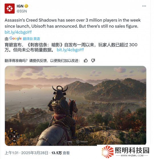 育碧官方宣布,《刺客信條:影》發(fā)售以來(lái)玩家總數(shù)超過(guò)300萬(wàn)人,游玩時(shí)長(zhǎng)超過(guò)4000萬(wàn)小時(shí)。