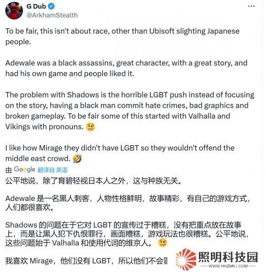 也有玩家認(rèn)為《刺客信條:影》的問(wèn)題不在于黑人男主,而在于育碧宣傳LGBT用力過(guò)猛: