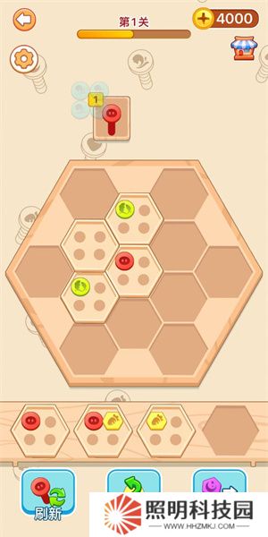 3、玩家們開始游玩之后,就需要將下方的六邊形方塊放置到上方的區(qū)域之中,每一個方塊里面會存在著數(shù)量不等的螺絲。