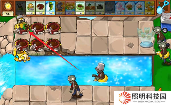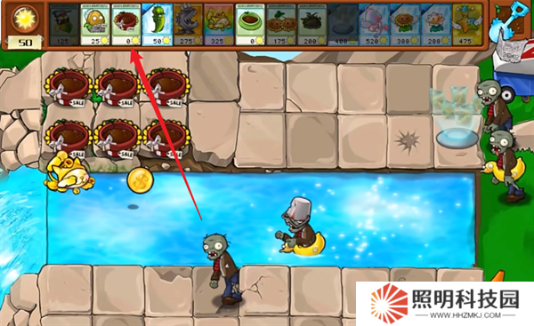 4、最后可以看到植物卡槽上指定植物的消耗減少了50