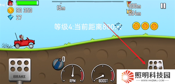 2、在關(guān)卡當(dāng)中點(diǎn)擊右下角的油門就能夠讓自己的賽車前進(jìn)。