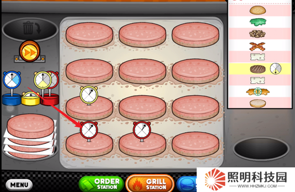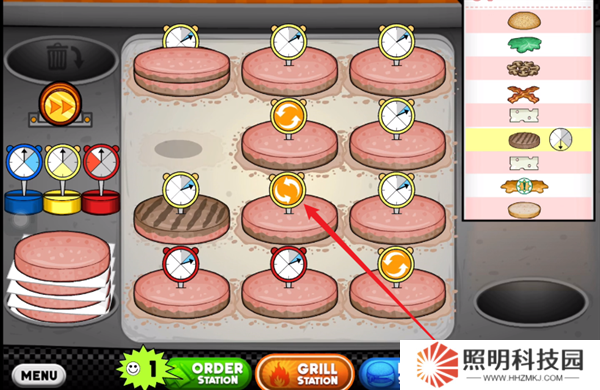 1、玩家們首先需要將自己后廚當(dāng)中的生肉餅放到烤盤上。