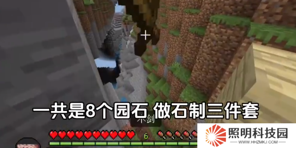 3.第一天可以平安度過,有個礦洞進(jìn)去挖點(diǎn)石頭,共是8個圓石做石制三件套,再收集幾個就能用熔爐燒肉了。