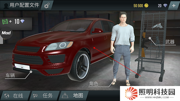 1、首先在本站下載安裝進(jìn)火力全開2城市狂熱游戲,進(jìn)入到游戲界面后,點(diǎn)擊人物身邊的車輛。