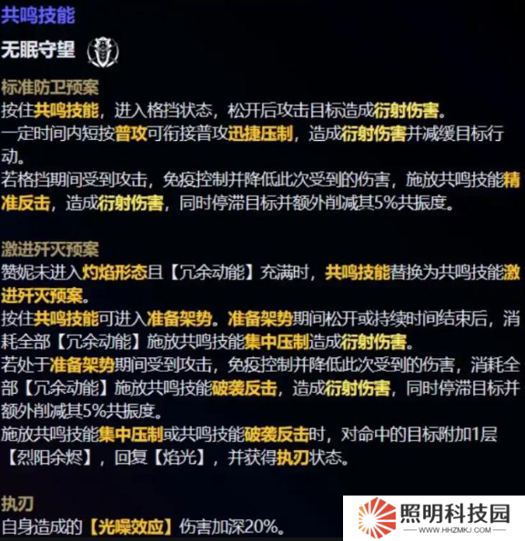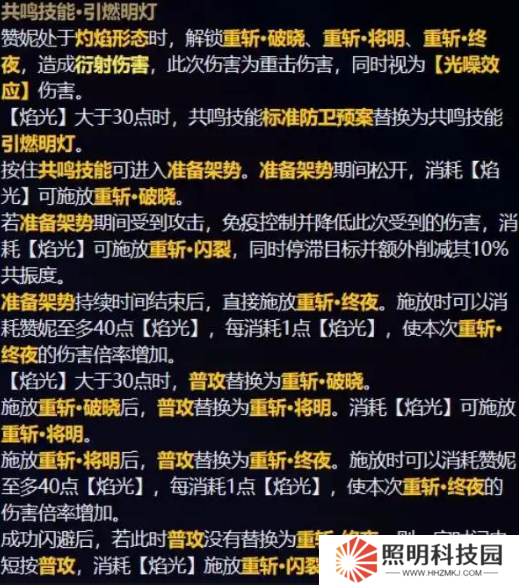 而開(kāi)大招后的第二形態(tài),共鳴技能就發(fā)生變化了,根據(jù)焰光的點(diǎn)數(shù)不同,造成的效果也不一樣,除了格擋之外,這里的主要輸出傷害定位是重?fù)魝Α?/p>