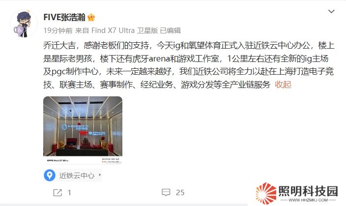 他在微博上寫到:喬遷大吉,感謝老板們的支持;ig和氧望體育正式入駐近鐵云中心辦公;1公里左右還有全新的ig主場及pgc制作中心,公司將全力以赴在上海打造電子競技、聯(lián)賽主場、賽事制作、經(jīng)紀(jì)業(yè)務(wù)、游戲分發(fā)等全產(chǎn)業(yè)鏈服務(wù)。