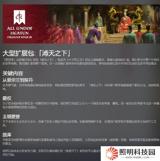 近日,戰(zhàn)爭策略游戲《十字軍之王3》正式公開了第四個(gè)大型DLC擴(kuò)展包“All Under Heaven”(溥天之下),預(yù)計(jì)將于今年年底推出。