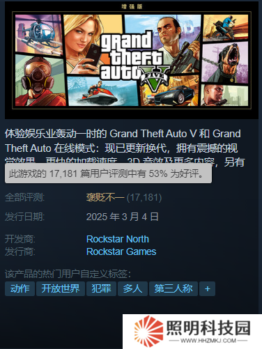 目前在Steam平臺,《GTA5》PC次世代版本(官方名稱《GTA5 增強版》),僅僅只有53%的好評率,為系列最低。這項數(shù)據(jù),甚至不如此前外包團隊開發(fā)的《GTA三部曲》。