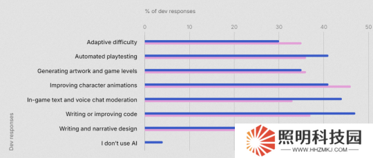 根據(jù)調(diào)查,即便接受度日益增高,整個行業(yè)的 AI 使用率依然比較穩(wěn)定。實際上 AI 的部分使用,例如在“自適應(yīng)難度”方面的使用有所下降。不過在其他領(lǐng)域,例如游戲測試方面則略有增加。