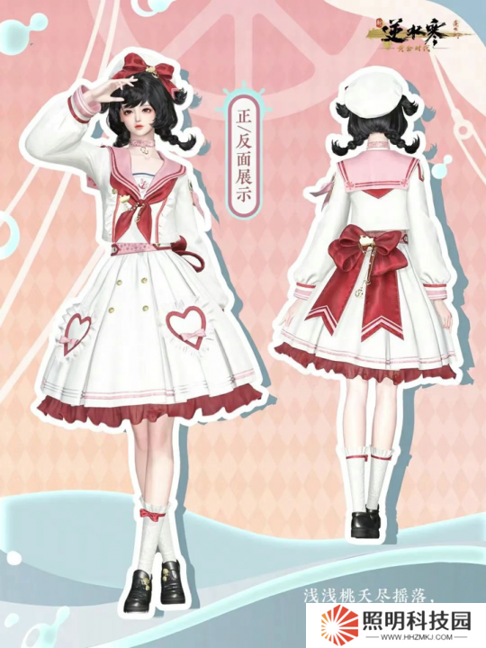 女款【桃心淺淺】,一身標(biāo)準(zhǔn)的天然呆少女造型,靈動氣質(zhì)讓人印象深刻。羊角辮發(fā)型配上粉白色系的JK蓬松小短裙,萌妹子的既視感這不就來了。還有點(diǎn)綴在裙擺的可愛蝴蝶結(jié)和粉色桃心圖案,少女心十足。