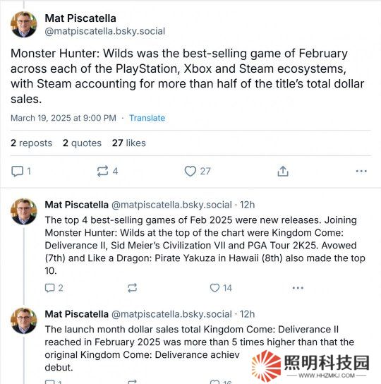 根據(jù)統(tǒng)計機構(gòu)NPD發(fā)布的數(shù)據(jù),除了《怪物獵人:荒野》外,2月發(fā)售的其他兩個新作——《天國:拯救》(2.4)和《文明7》(2.11)也都上榜,分列第二和第三名。黑曜石新作《宣誓》排名第七。