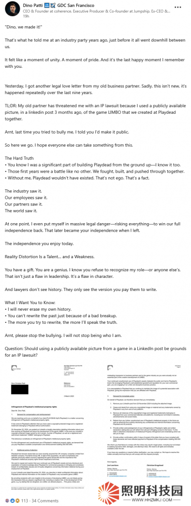 Patti 在 3 月 3 日收到了最新的訴訟“威脅”。這封信件中,Jensen 聲稱 Patti 去年末發(fā)布的一篇討論《地獄邊境》開發(fā)的領英長篇帖子侵犯了版權。這篇已經(jīng)刪除的帖子中,包含了一張 Jensen 聲稱“未授權”的圖片,而 Jensen 則要求 Patti 支付 50 萬丹麥克朗的補償。