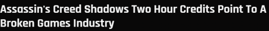 ·根據(jù)對過去發(fā)售的主流游戲通關(guān)謝幕作比較,上一部育碧大作《刺客信條:幻景》約50分鐘,這回直接翻倍,其他公司的大作比如《最后的生還者2》16分鐘,《賽博朋克2077》40分鐘,本次的《刺客信條:影》算是刷新了史長新紀(jì)錄。