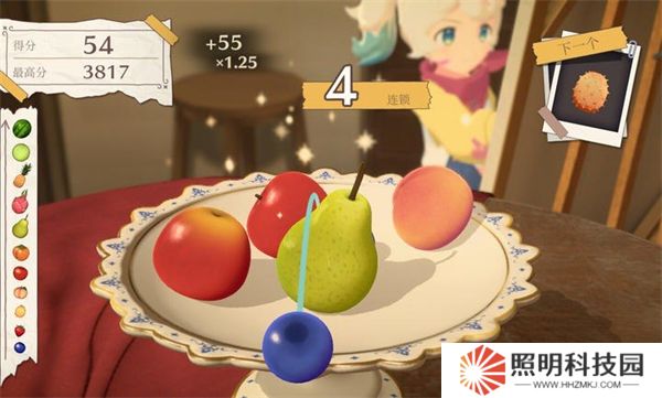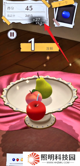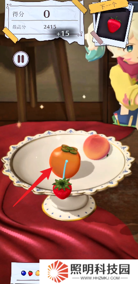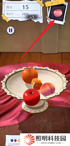 2、進(jìn)入關(guān)卡挑戰(zhàn)之后就會(huì)出現(xiàn)一個(gè)水果盤,點(diǎn)擊屏幕可以將手中的水果投擲出去。