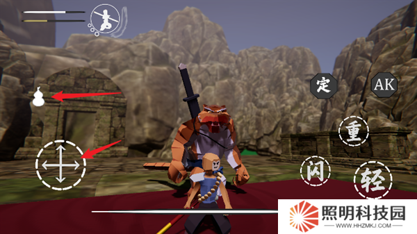 2、進入到場景內(nèi)后,玩家們滑動輪盤控制角色移動,點擊葫蘆恢復(fù)生命值。