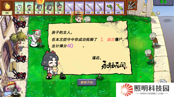 5、當(dāng)僵尸進入到房間內(nèi)后即為挑戰(zhàn)失敗,我們可以在結(jié)算界面看到抵御的波次和總計的得分。