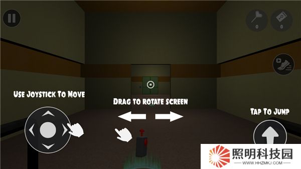 3、過(guò)程動(dòng)畫播放完畢之后就會(huì)進(jìn)入到新手教學(xué)的階段,玩家點(diǎn)擊屏幕可以選擇你想要的視角,點(diǎn)擊方向虛擬鍵盤可以控制角色方向,點(diǎn)擊向上按鈕可以跳躍。