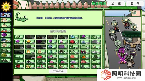 4、在界面的右側(cè)可以看到僵尸的類型,接著玩家們選擇需要出場的植物,完成后點(diǎn)擊開始戰(zhàn)斗。