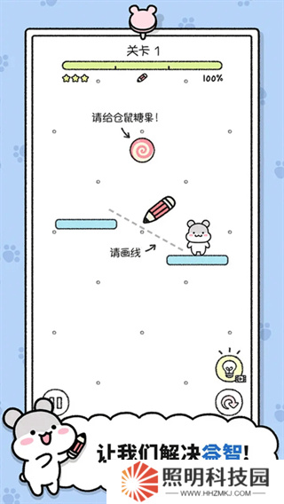 3.手指劃兩下,畫出黑線調(diào)整糖果的走勢,幫助小倉鼠獲取糖果,獲取更多的星星,需要玩家謹(jǐn)慎思考。