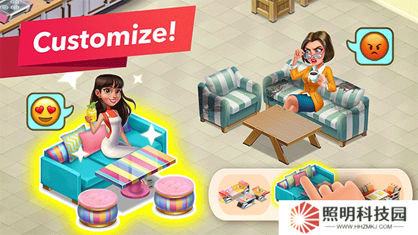 1.整體畫風為歐美風格,玩家可以根據(jù)自己的喜好進行裝修自己的咖啡廳,發(fā)揮自己的設計天賦,擺放各種家具裝飾等。