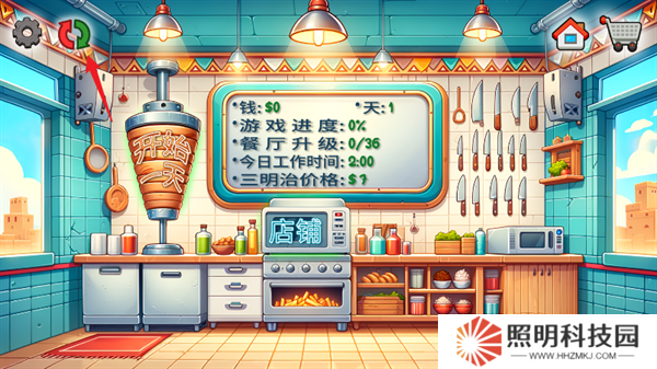 2、然后玩家們就會(huì)進(jìn)入到沙威瑪?shù)赇伒慕缑娈?dāng)中,你可以點(diǎn)擊店鋪開(kāi)始進(jìn)行經(jīng)營(yíng),或者點(diǎn)擊右上角的購(gòu)物車圖標(biāo)來(lái)購(gòu)買更多的設(shè)備。