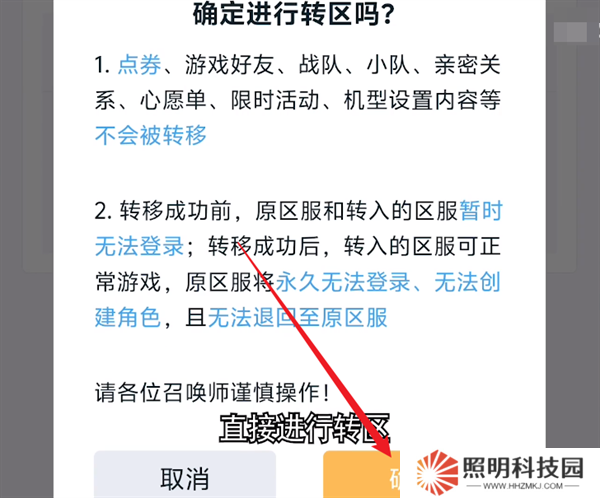 4、如果確認轉區(qū)之后,就會跳轉一個轉區(qū)說明,注意點券、游戲好友、親密關系、戰(zhàn)隊以及小隊都是不可以轉移的。