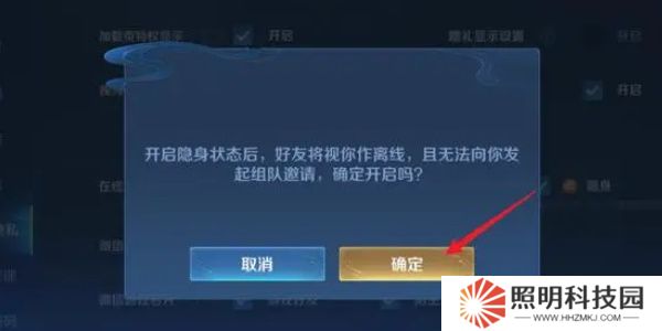 4、接著會彈出一個確認彈窗,只需要點擊確認就能夠讓自己的賬號變?yōu)殡[身狀態(tài)。