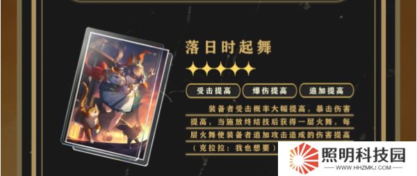 裝備者受擊概率大幅提高,暴擊傷害提高,當施放終結技后獲得一層火舞,每層火舞使裝備者追加攻擊造成的傷害提高。