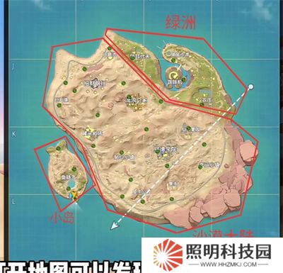 從地圖上看喵沙島主要由沙漠、綠洲及小島三塊組成,地圖大小跟超新星和彩虹島差不多,一局作戰(zhàn)時長約15~20分鐘之間,地形以沙漠為主,地勢平坦。植被稀疏,掩體較少。