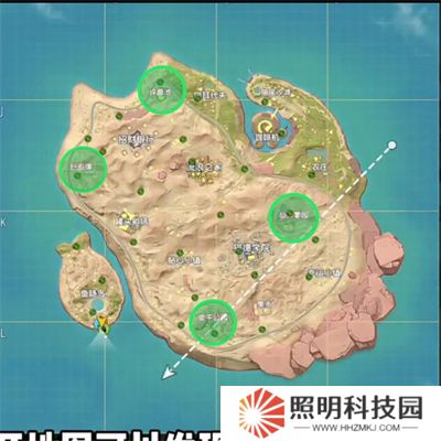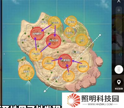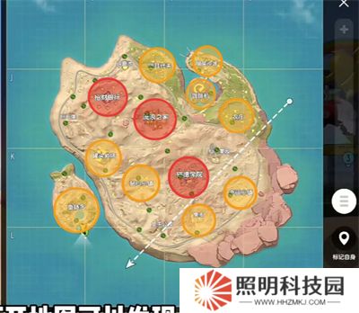 這是喵沙島高級物資地點(紅區(qū)域)及中等物資地點(黃區(qū)域)。