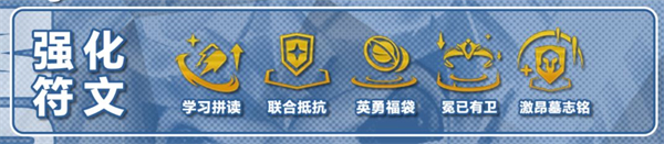 學(xué)習(xí)拼讀(提升巨大,技能傷害可過千)、聯(lián)合抵抗、英勇福袋、冕已有衛(wèi)、激昂墓志銘(有護盾提升較大)