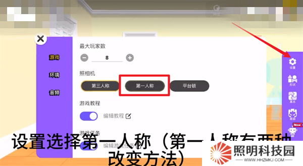 4、進(jìn)入到空房間的模板之后,玩家們要再右邊的設(shè)置里面將照相機(jī)調(diào)整成【第一人稱】。