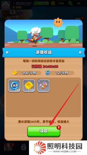 2、然后就會彈出游獵功能的界面,玩家們將能夠在這里獲取到掛機的獎勵,最多掛機24小時,點擊下方的領(lǐng)取按鈕就能夠進行領(lǐng)取。
