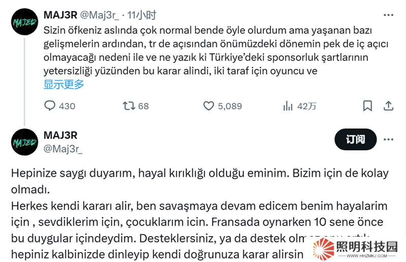 MAJ3R:“你們的憤怒是可以理解的,換做是我也會有同樣的反應(yīng)。但由于一些事件的發(fā)生,接下來的這段時間對土耳其來說不會太樂觀,而且很遺憾,國內(nèi)的贊助條件也不盡如人意??紤]到這些因素,我們做出了對戰(zhàn)隊(duì)陣容和俱樂部來說都是最佳的決定。在這方面,我想坦誠地說。我也希望情況能有所不同,但這確實(shí)是最好的選擇了。我尊重你們所有人,也知道你們很失望。這對我們來說也并不容易。有時候你不得不做出艱難的決定。我會繼續(xù)為了我的夢想、為了我所愛的人、為了我的孩子們而奮斗。十年前我在法國打比賽的時候也有過類似的感受。無論你們是否支持這一決定,聽從你們內(nèi)心的聲音,自己做決定就好。 ”