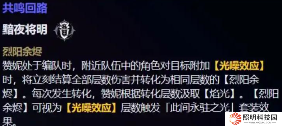 共鳴回路這一塊意外的簡(jiǎn)單,贊妮處于編隊(duì)的時(shí)候,附近隊(duì)伍中的角色對(duì)目標(biāo)附加光噪時(shí),立刻結(jié)算全部層數(shù)傷害并轉(zhuǎn)化成相同層數(shù)的烈焰余燼,每次發(fā)生轉(zhuǎn)化,贊妮根據(jù)層數(shù)汲取焰光,這個(gè)同樣可以觸發(fā)新光套。
