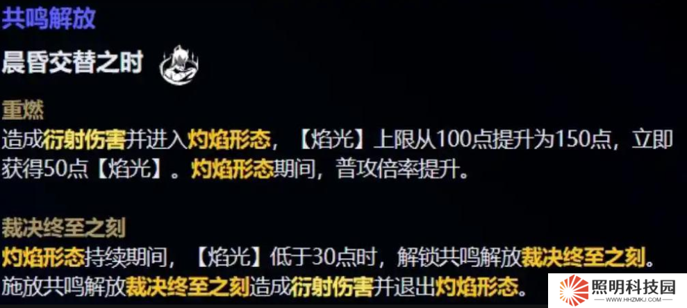 而開(kāi)大招后的第二形態(tài),共鳴技能就發(fā)生變化了,根據(jù)焰光的點(diǎn)數(shù)不同,造成的效果也不一樣,除了格擋之外,這里的主要輸出傷害定位是重?fù)魝Α?/p>